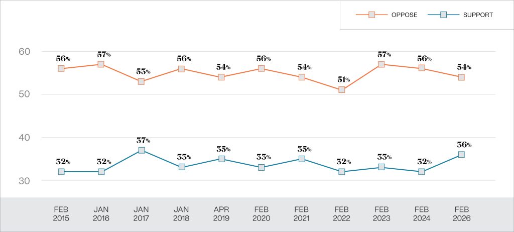 56% of Alaskans oppose the proposed Pebble mine project according to a statewide survey of 800 registered voters conducted from February 5-12, 2024. These numbers are consistent with polling dating back to at least 2013; opposition to the mine has never dipped below 51%, and support has never risen above 37%. In 2014, two-thirds of the state backed a ballot measure that requires legislative approval for large-scale mining in Bristol Bay. More than 75% of BBNC shareholders oppose Pebble, based on a 2019 survey of more than 4,000 shareholders.